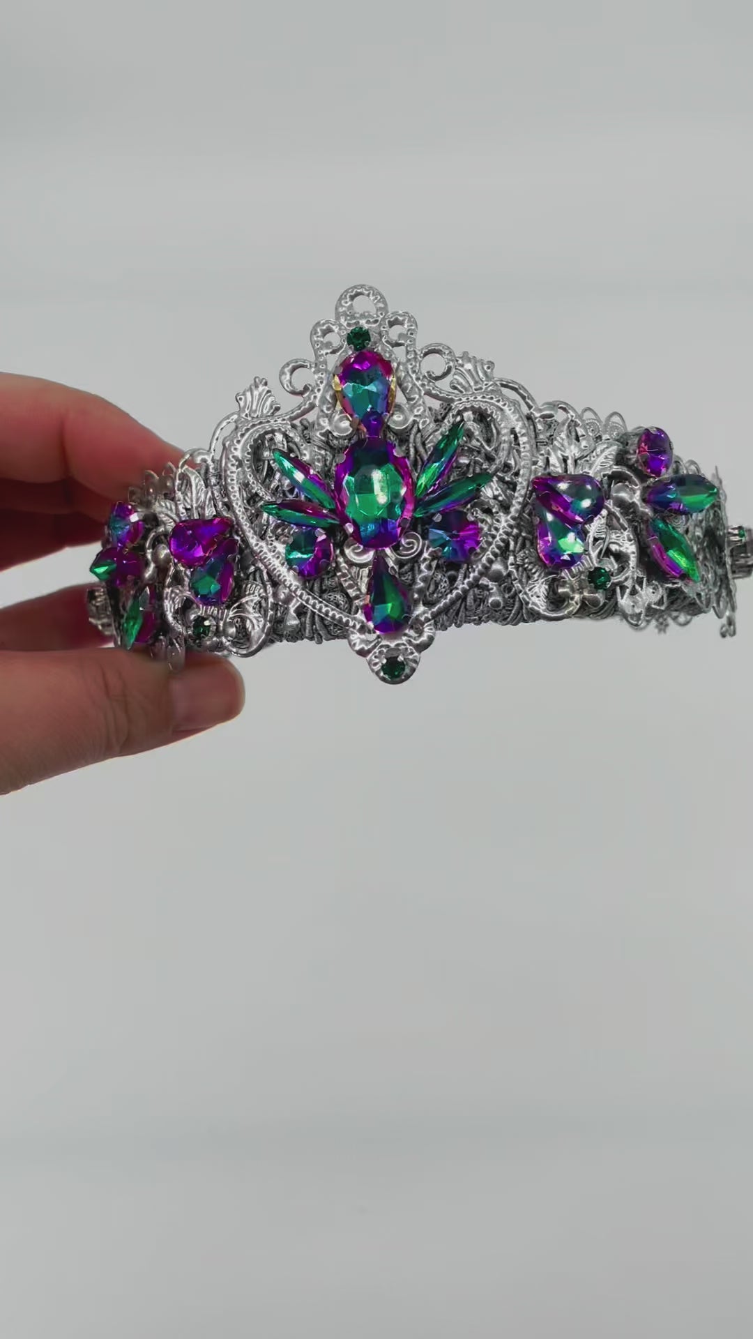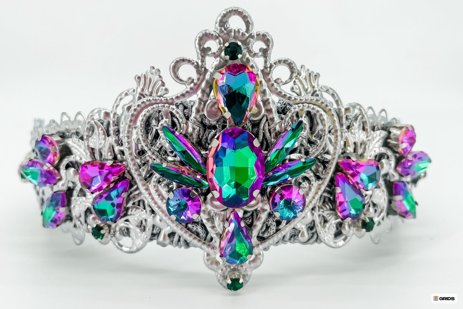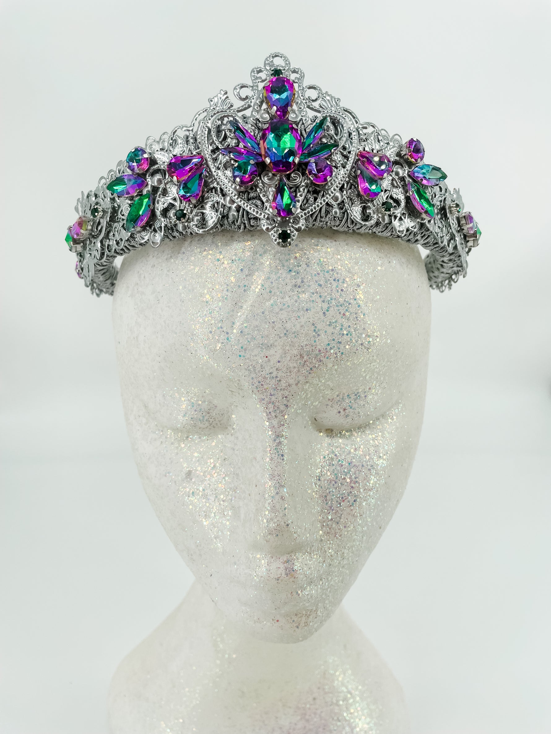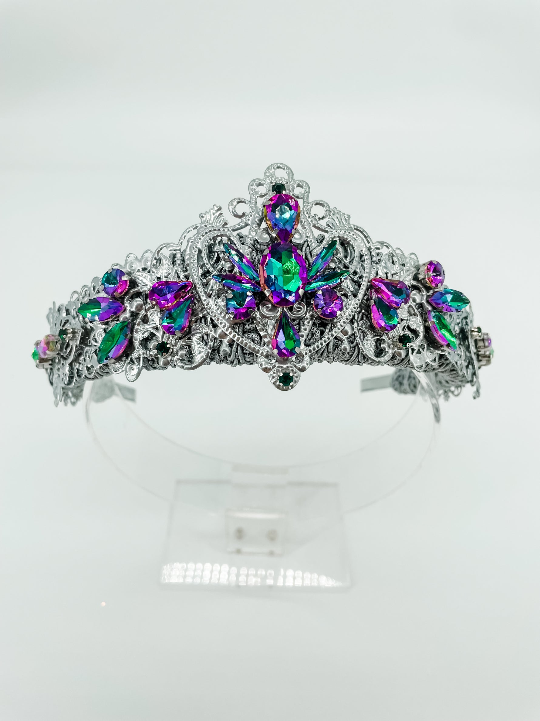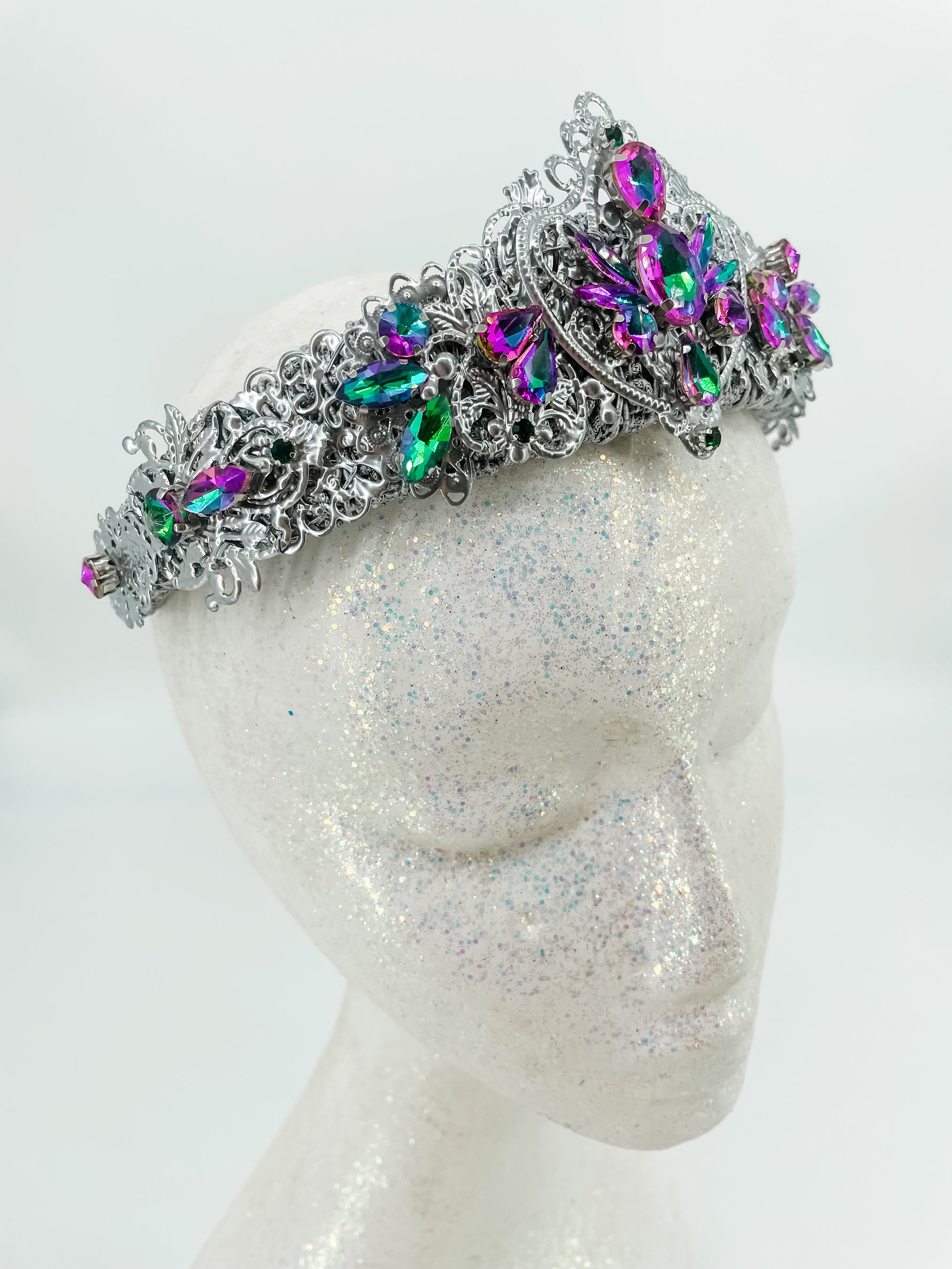 The light weight and flexible design, constructed with precision, hand stitched and secured with epoxy resin, ensures a perfect fit for any head size. Make a statement at special parties, gala events, or photo shoots with this unique and exclusive tiara.