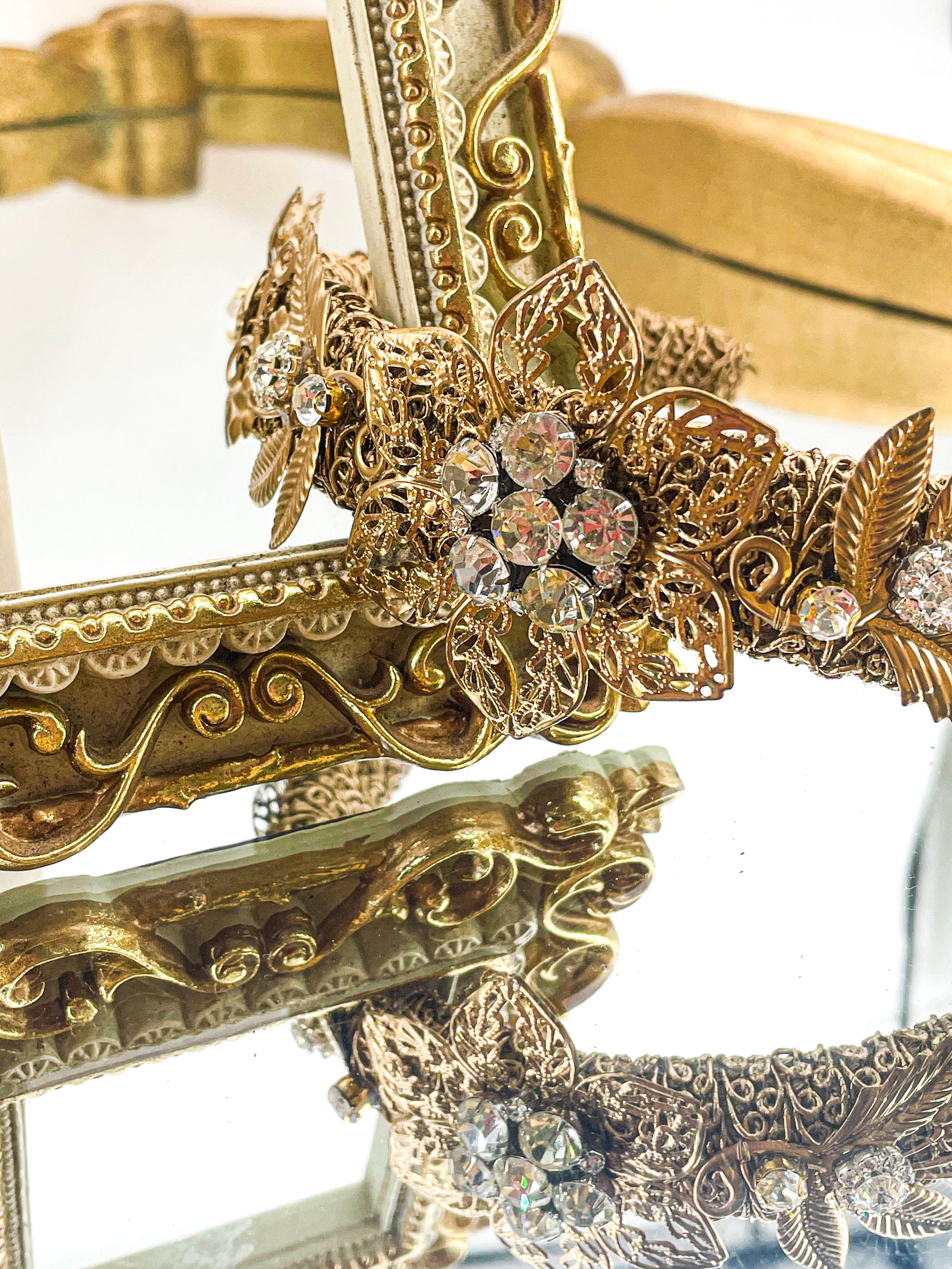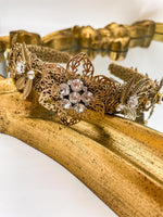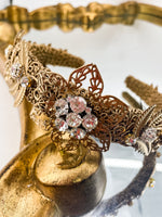 This enchanting golden toned filigree headpiece is the perfect accessory for a magnificent event, spectacular costume or fantastical photoshoot.